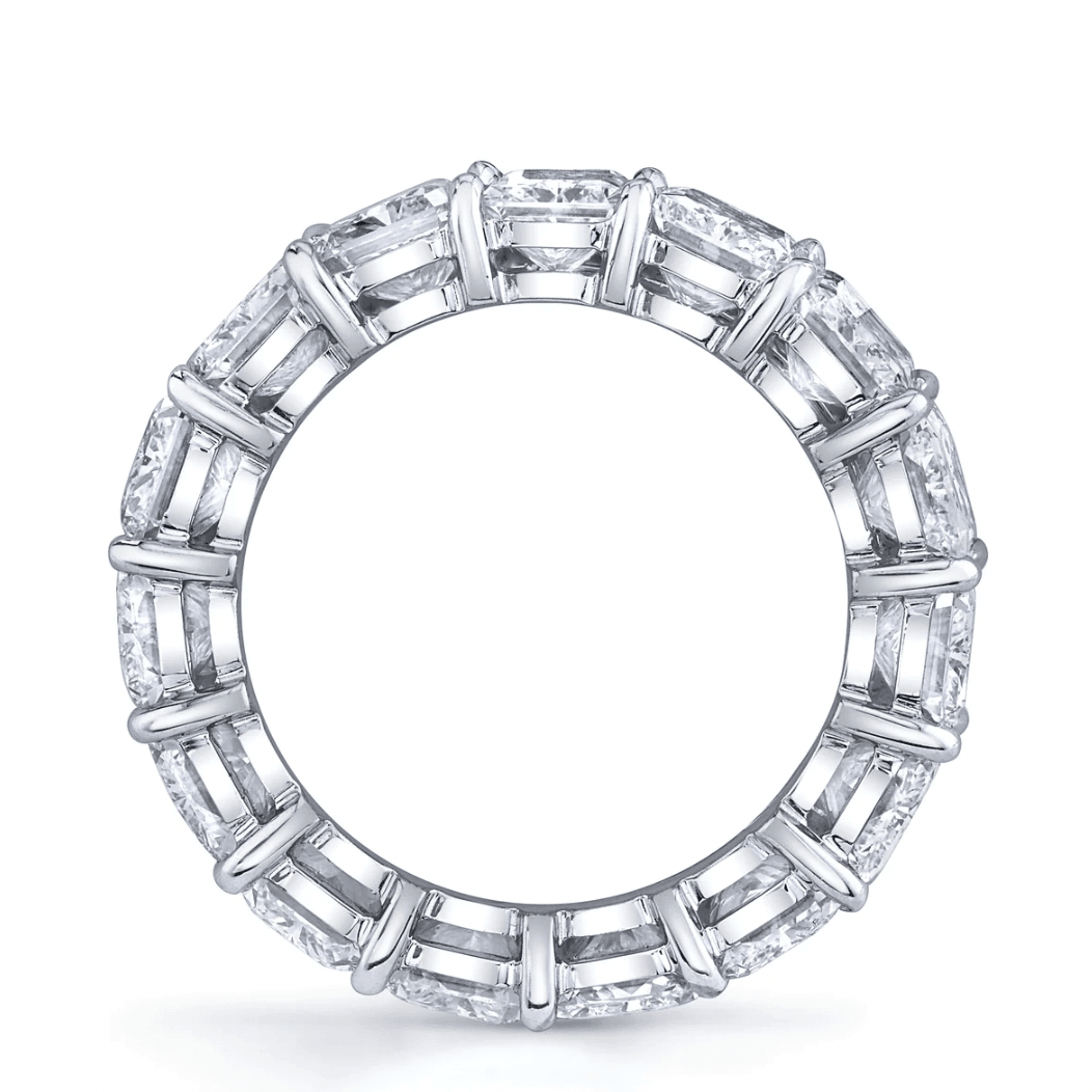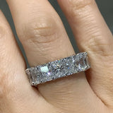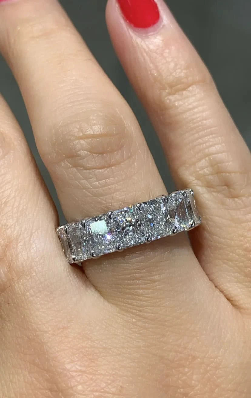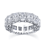 Prepare your eyes for the luscious visual feast in this out of this world moissanites band. A real head turner, this spotless piece features a very remarkable emerald-cut moissanites as the focus. Dazzling radiant cut moissanites are pave set around it creating a halo design. The round diamonds continues down the superb open style shank to enthrall your eyes. Alluring side cutouts and detailed antique style hand etching creates a striking look that adds elegance and stature to this amazing piece. This ring is available for 14k White/Yellow Gold and Platinum plated upgrade for the more particular. With Diamond Mansion's Rings, You can Walk down the aisle in style!